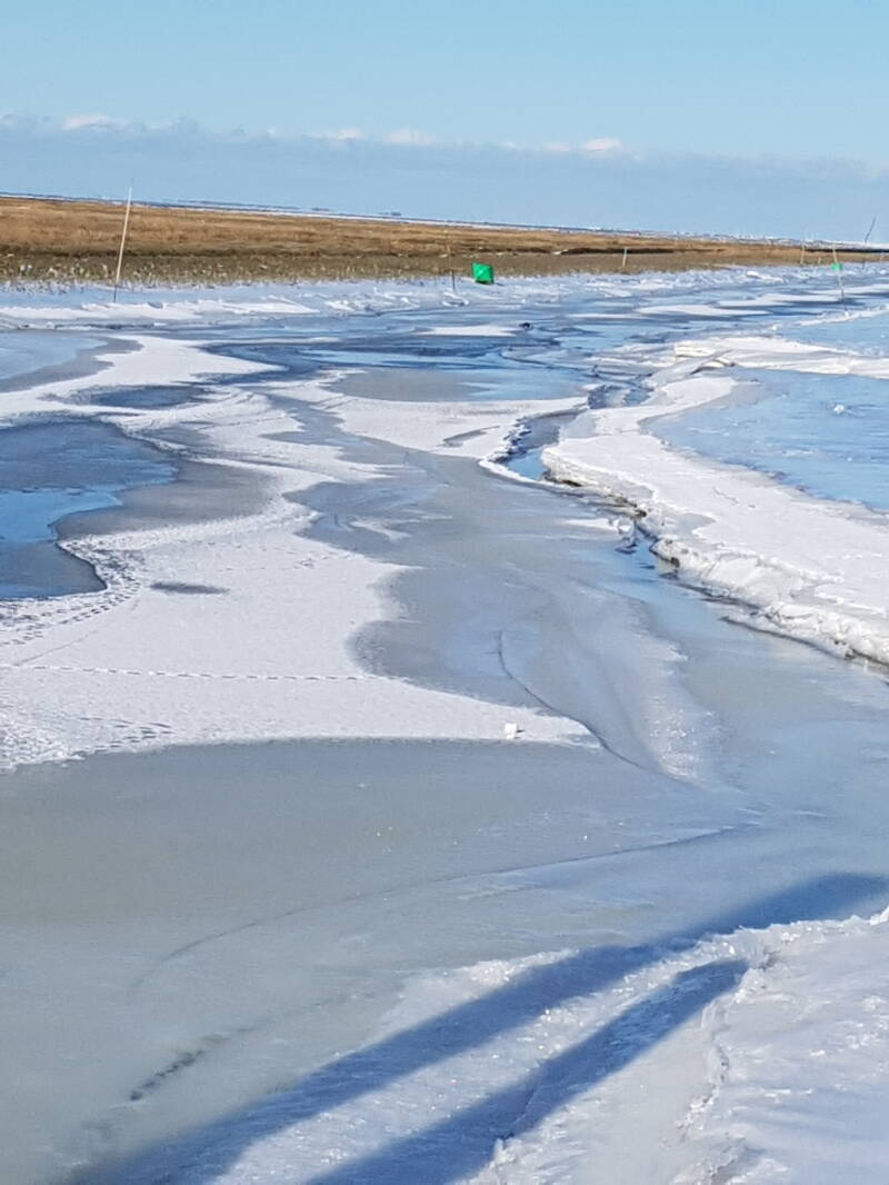 Door de vorst, die een week lang duurde met in de nachten matige tot strenge vorst, lagen de kwelders achter de zeedijk en een deel van de vaargeul dicht gevroren met ijs.